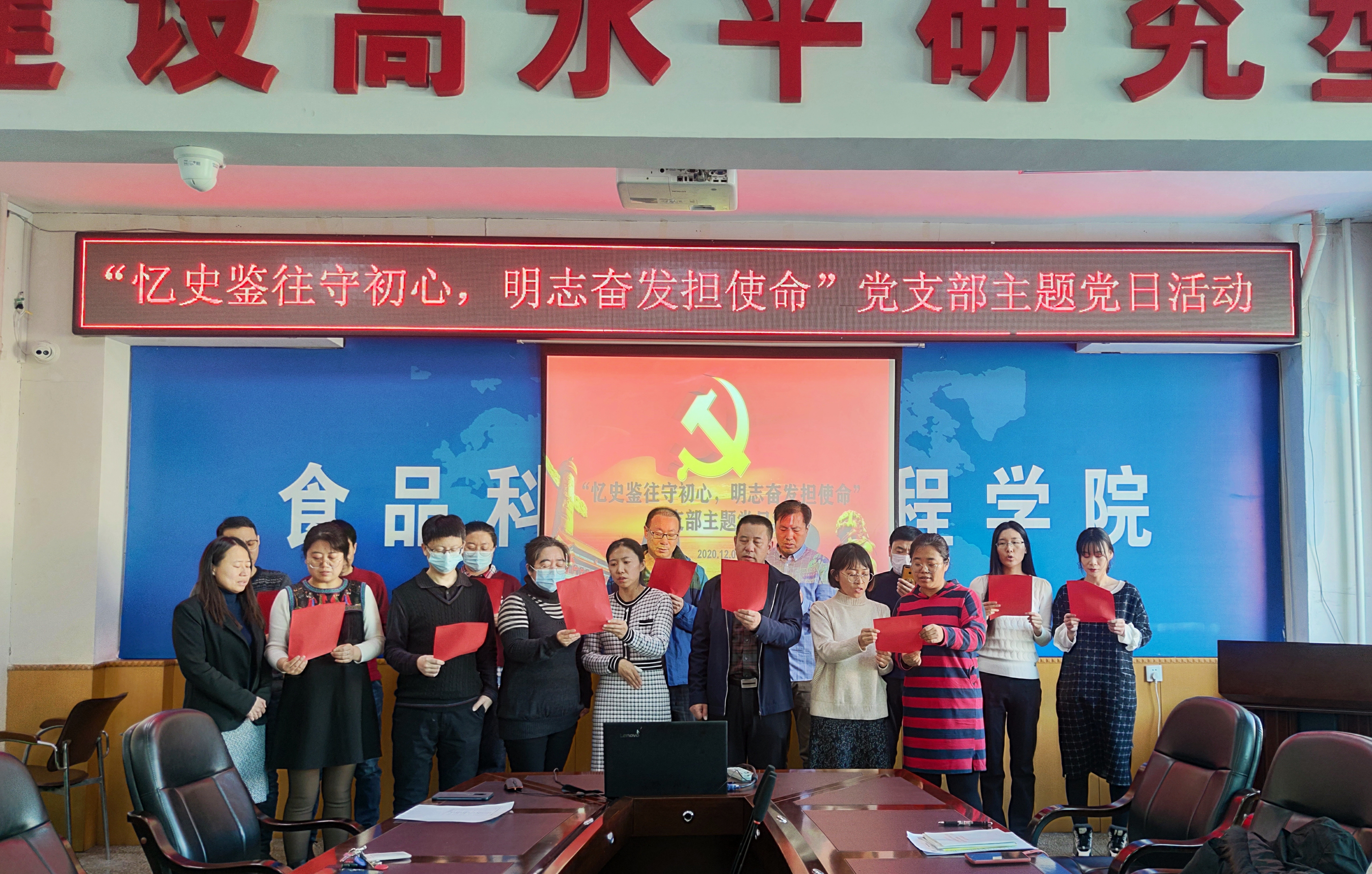 根据“不忘初心、牢记使命”主题教育部署安排,贯彻落实“不忘初心、牢记使命”主题教育精神,2020年12月7日下午,beat365中国唯一官网机关党支部与食品质量与安全系教师党支部在食品楼三楼会议室举办“忆史鉴往守初心,明志奋发担使命”主题党日活动。主题党日活动由学院机关党支部书记马爽同志主持。