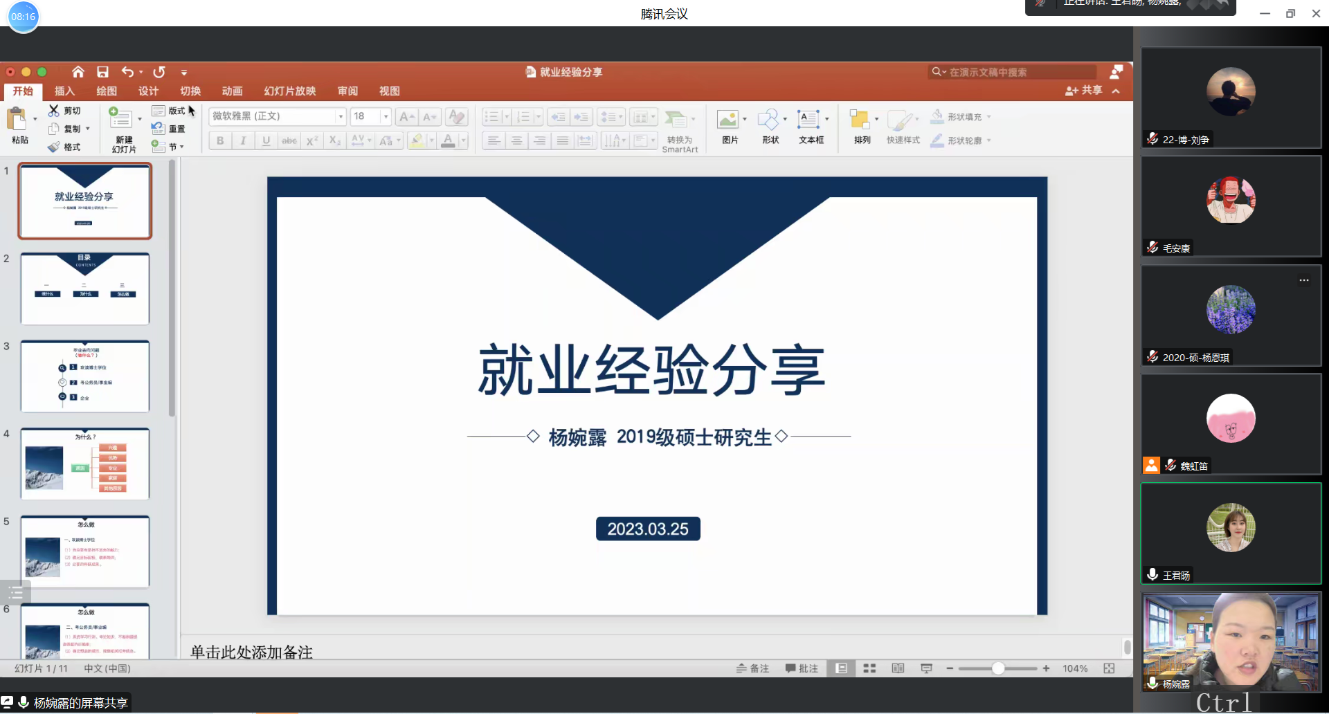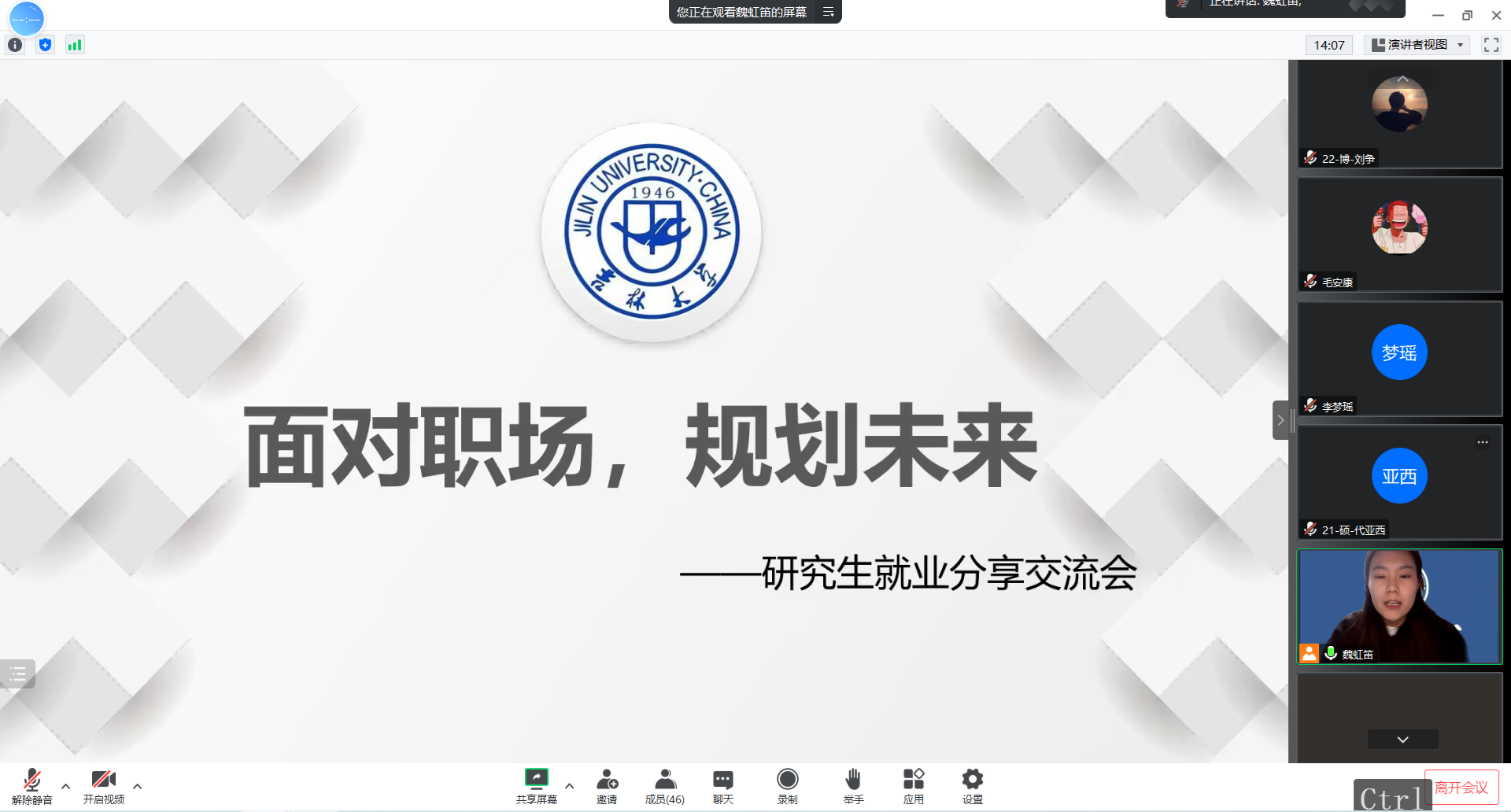 会上,王君旸师姐向同学们介绍了目前入职高校的现状,并根据自己的经历提出了多项宝贵意见,包括合理规划时间、认真制作简历,请教前辈具体细节等。杨婉露师姐从做什么、为什么、怎么做三方面给同学们分享了求职经验,并针对如何查询就业信息进行了详细的梳理。张茜师姐首先介绍了自己读研期间的实习经历,然后针对体制内与体制外工作特点向同学们提出了自己的求职建议,最后向同学们展示了自己求职过程中的时间安排以及心路历程。在“云端互动”环节,三位毕业研究生针对同学们提出的问题做了详细的解答,并留下了自己的联系方式,以便同学们联系与咨询。