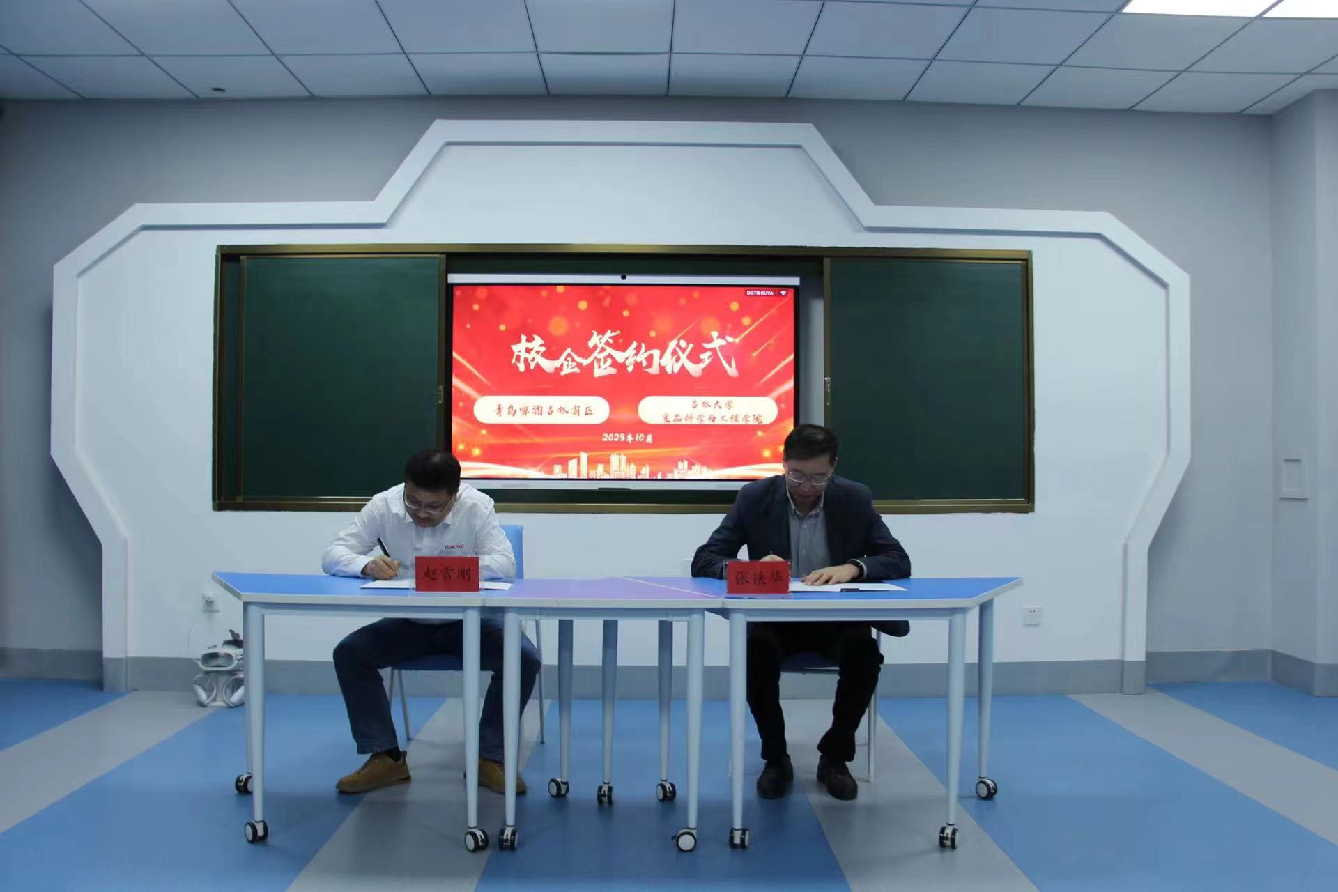 最后,张铁华与赵雪刚作为双方代表在教室共建合作协议上签字。签约仪式后,董怀智与赵雪刚共同为共建教室“食品感官评价室”揭牌,双方所有代表合照留念。