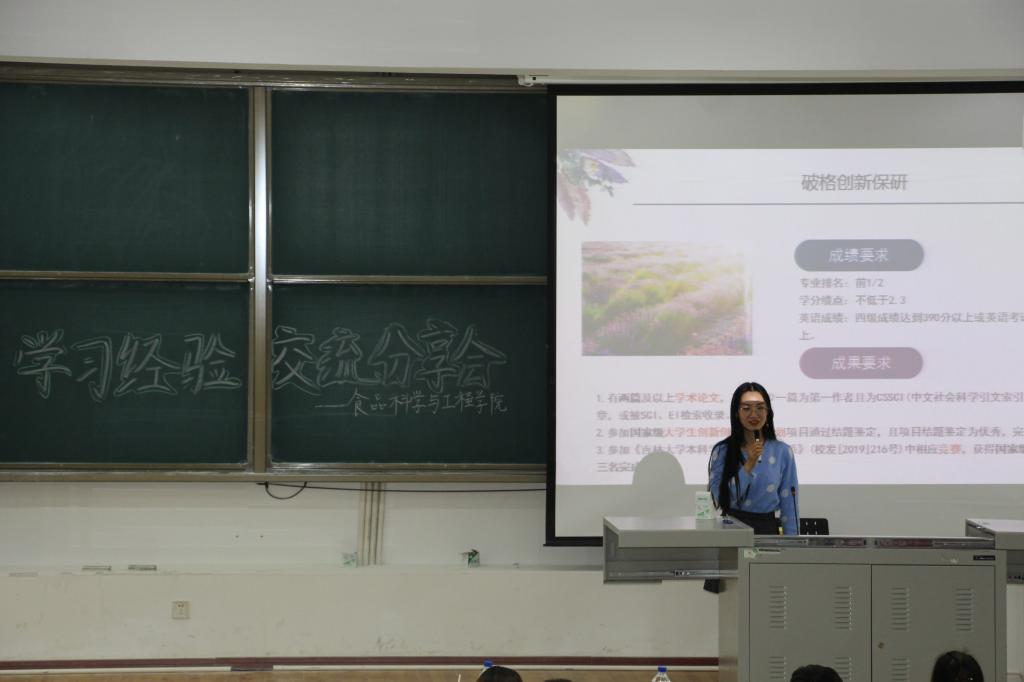 活动过程中,在本校直博的李亚娟学姐分别就学习与生活、竞赛与科研、保研与直博三个方面一一分享交流,建议大家学会让“优秀成为一种习惯”; 本校保研的王艳飞学长详细分享了大一学习经验,讲解了在大二、大三面对不同选择时所做的规划;本校保研的李佳丽学姐先介绍了重点基础课程的学习方法,随后向大家推荐了一些有用的APP和公众号;保研到复旦大学的李媛学姐与大家探讨了大学的意义,并分享了一些人生感悟,认为大学应是一段拥有丰富的业余生活、过硬的专业素养及真挚的感情经历的美好时光;创新保研的李继红学姐着重强调了英语对于学习、工作等的重要性,以自己的话语——“勤奋使我快乐”来激励大家;出国留学的蹇瑜璇学姐通过讲述自身出国留学的准备历程,向大家分享了关于出国留学方面的经验。最后,19级同学结合大学学习方法、专业兴趣培养、社团活动等方面与几位优秀学长进行了提问与互动。