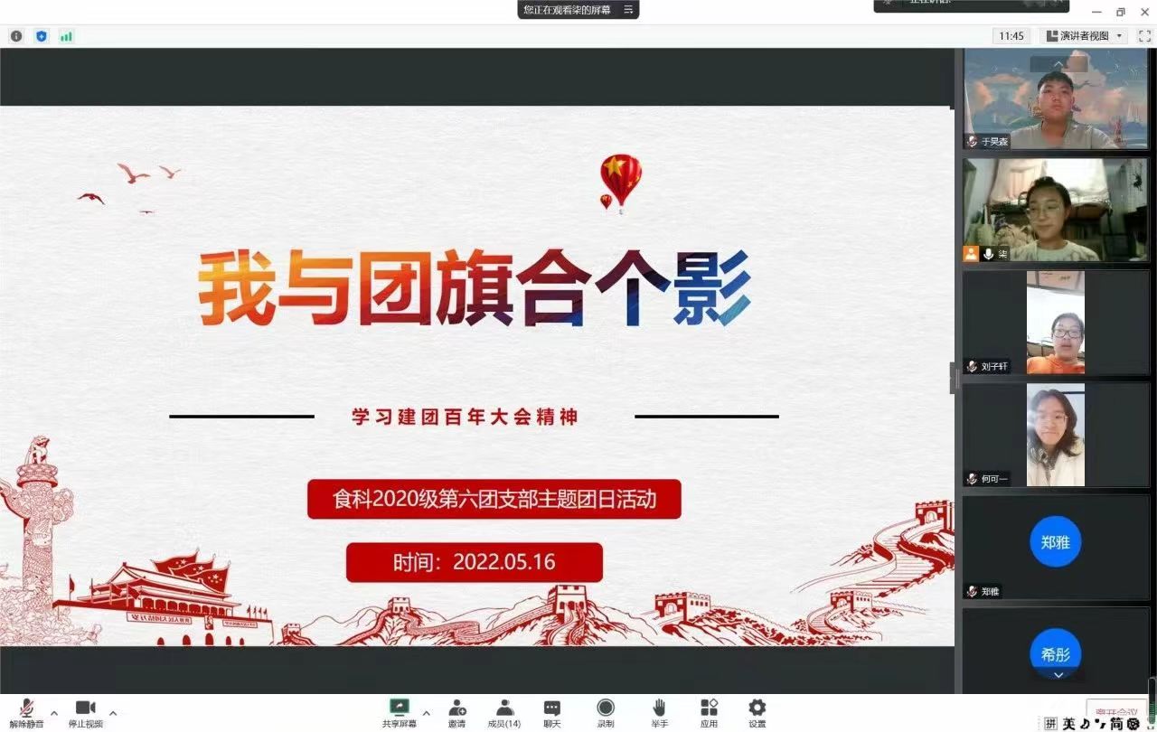 为响应团支部号召,beat365中国唯一官网2020级第六团支部于2022年5月16日线上开展了以“我与团旗合个影”为主题的团日活动,一共有16位团员参加会议。会议上,同学们一起学习了习近平在庆祝中国共青团成立100周年大会上的重要讲话,了解共青团成立以来的百年征程,明白了共青团的带领作用对当代青年的历史意义,决意从我做起,自觉担当尽责,做有志青年,严格履行团员义务,以成长为一名合格的共产党员为光荣,为党和人民的事业发展贡献自己的一份力量。
