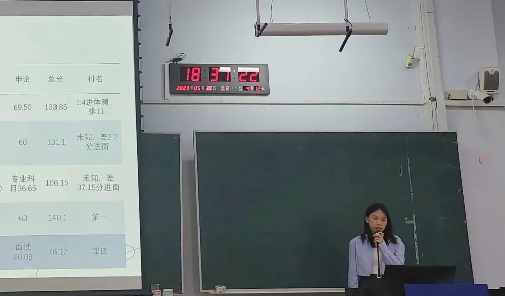 张罂月学姐首先介绍各个地区的考试情况汇总,根据自身经验提出建议,指导如何选择最有利的岗位,便于更长远的发展。她指出运用好大数据很重要,并向同学们介绍自己选出的较为合适的网站、APP与资料。