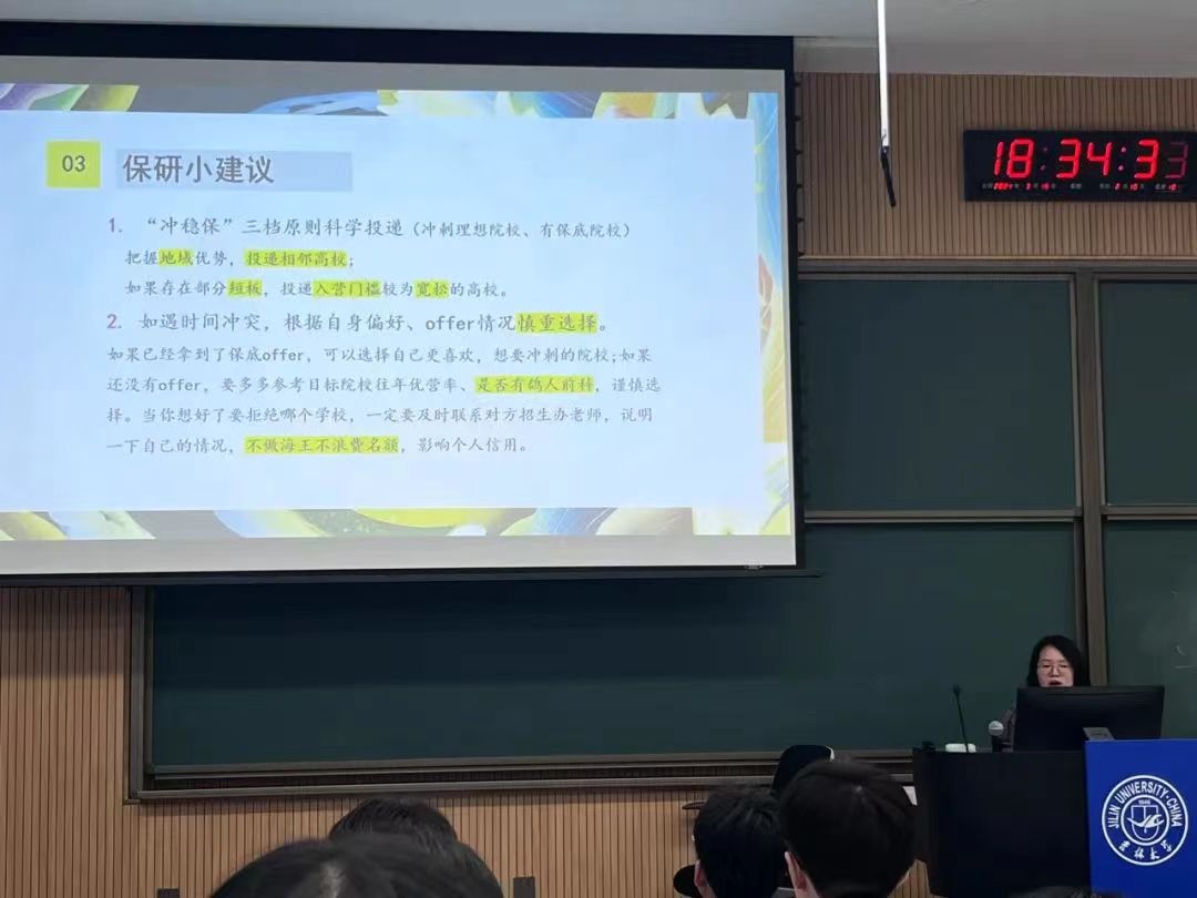 随后,李舒粤学姐着重介绍了保研过程中的技巧。在她看来,保研是一场信息“战”,打破信息差是关键,她分享了自己准备各类保研文书资料的经验,告诫同学们及时调整心态,不到最后一刻绝不轻言放弃,抓住机会,成功上岸!