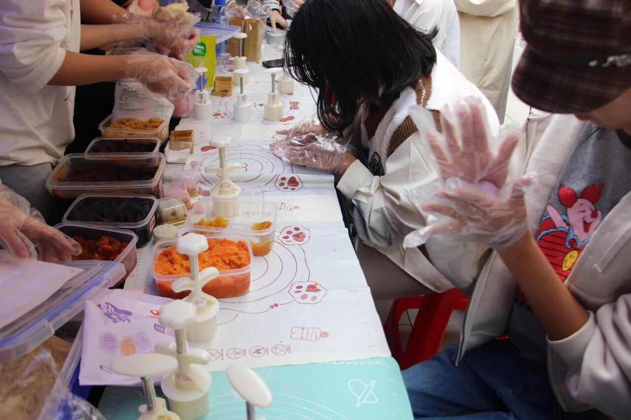 活动现场,没有了往常课堂的严肃,取而代之的是面粉的清香与同学们的欢声笑语。在志愿者的指导下,大家化身“糕点师”,从团圆冰皮到称量馅料,从小心翼翼包馅到用模具压出精美花纹,每一步都是一次专注的创造。当印有“吉大”、“中秋”等字样的月饼从模具中脱出的瞬间,惊喜与成就感洋溢在每个人的脸上。