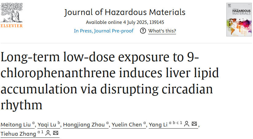 近期,吉林大学张铁华,李杨教授团队在环境科学与工程领域的国际顶级期刊《Journal of Hazardous Materials》(Q1,中科院1区,IF=12.2)在线发表题为“Long-term low-dose exposure to 9-chlorophenanthrene induces liver lipid accumulation via disrupting circadian rhythm”的研究文章。首次在 C57BL/6 小鼠中研究了慢性低剂量暴露于 9-ClPhe 对肝脏脂质积累和昼夜节律的影响,分析了涉及 AHR 受体的机制。吉林大学张铁华教授和李杨教授为共同通讯作者,博士后刘美彤为第一作者。