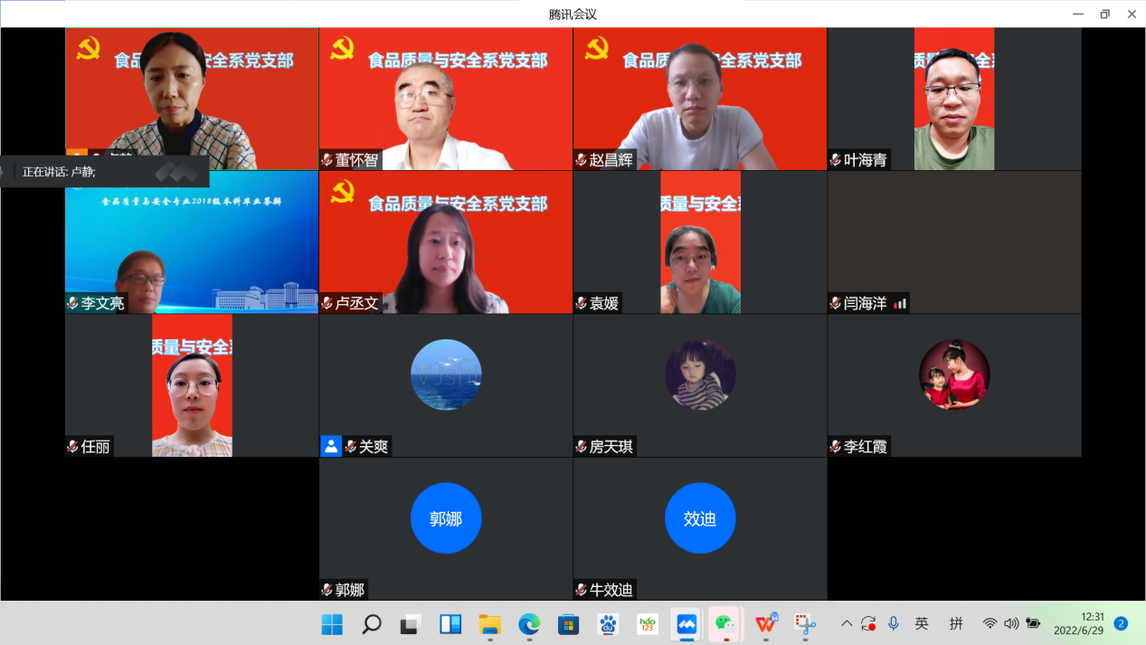 6月29日,为庆祝中国共产党成立101周年、迎接党的二十大,落实学校组织部《关于组织开展庆祝中国共产党成立101周年暨“喜迎二十大、奋进新征程”主题系列活动的通知》要求,按照学院统一布置,食品质量与安全系教工支部通过腾讯会议平台线上开展“践行大年精神,喜迎二十大,奋进新征程”主题党日活动。活动由支部书记卢静主持,学院党委书记董怀智参加活动。