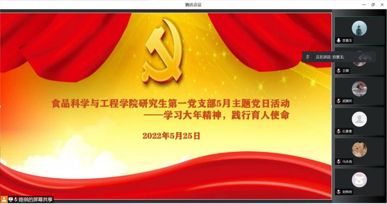 最后,支部书记宫景玉对研究生党员们提出了三点要求:一是大家一定要牢记习近平总书记的嘱托,以黄大年同志为榜样,学习他牢记初心、甘于奉献的精神,心有大我、至诚报国的爱国情怀;二是积极发挥党员先锋模范带头作用,以实际行动践行初心使命,争做疫情防控的助力者、健康校园的守护者;三是新时代青年应将自身的成长成才与党和国家的前途命运紧密结合起来,坚定初心使命,勇担时代责任,付出实际行动,践行“请党放心,强国有我”的铮铮誓言,为中华民族伟大复兴贡献青春力量!
