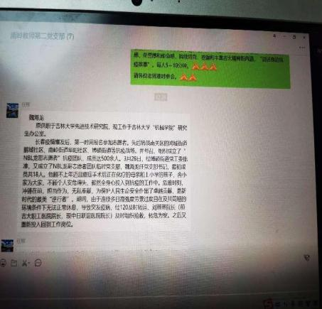 活动中每位党员表示:通过参加学校和学院组织的《黄大年》观影,《黄大年》话剧、学习“黄大年精神的档案记忆”等纪念习近平总书记对黄大年年纪事迹做出重要指示五周年活动,深受黄大年老师精神所感动;在长春面对“疫情”严峻情况下,被战斗在抗疫一线的“显形志愿者”如医务工作“大白”、各界的志愿者“小白”们的行为所感动,同时也被看不见的背后的“隐形志愿者”如身边的老师、学生、家人和邻居,他们的默默付出,也是值得敬佩和学习的。如任辉老师分享的吉林大学“机械学院”研究生办公室的魏海龙老师的带病抗疫、速建临时党支部的故事,周亚军老师分享学院陈艳等老师、学生及其家人的防疫故事,王笑丹老师分享的本班学生张凤兰做志愿者的收获,董周永老师分享的家人“大白”、身边同校老师的故事等等,这些故事都充分体现出:在国家遇见困难的时候,党员起到了先锋模范作用,党支部起到了战斗堡垒作用,只要大家团结一心,齐心协力,互相帮助和互相鼓励,就一定能战胜一切困难,迎来春暖花开之时。通过故事的分享和交流,更提升了支部党员对黄大年精神的理解和感悟,强化了支部党员的凝聚力和战斗力。