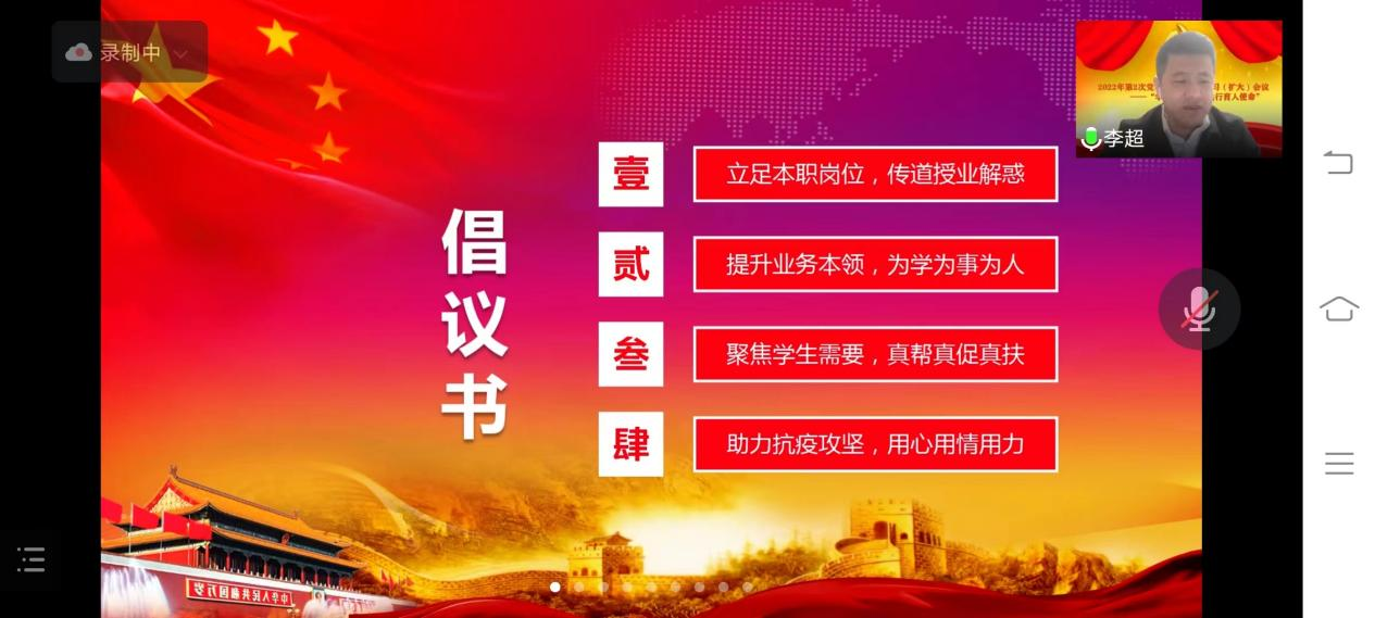 随后,党委副书记李超宣读了学院党委"学习大年精神践行育人使命"的倡议书,从“立足本职岗位、传道授业解惑;提升业务本领、为学为事为人;聚焦学生需要、真帮真促真扶;助力抗疫攻坚、用心用情用力”四个方面向全体教师发出倡议,作为一名中国特色社会主义高等教育工作者,要从自己做起,从本职岗位做起,扎实践行“为党育人 为国育才”使命,弘扬黄大年同志的崇高精神,把爱国之情、报国之志融入祖国改革发展的伟大事业之中、融入人民创造历史的伟大奋斗之中,在实现“两个一百年”奋斗目标、实现中华民族伟大复兴的中国梦的时代进程中贡献智慧和力量。