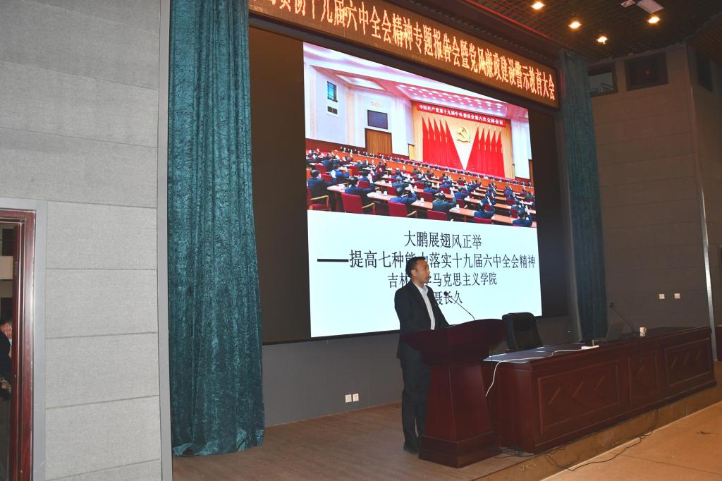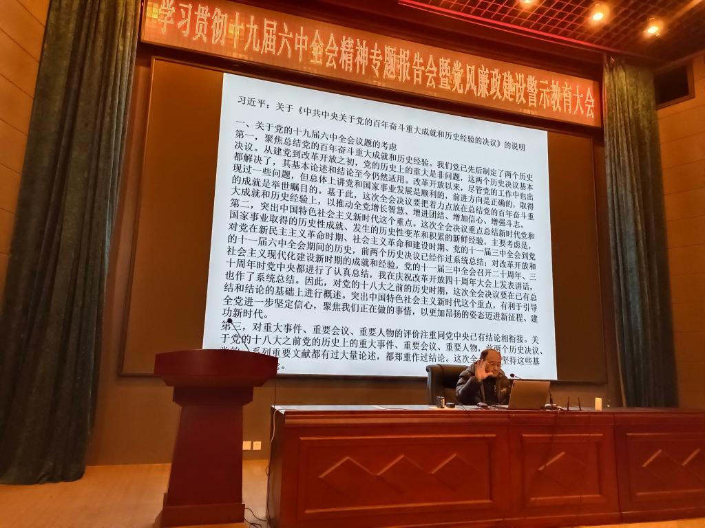 专题报告会邀请到吉林大学十九届六中全会精神宣讲团成员、马克思主义学院聂长久副教授。聂老师以“提高七种能力,落实十九届六中全会精神”为题,从十九届中央历次全会的背景及内容、十九届六中全会的公报、决议及要点进行了详细的解读,并就如何提高七种能力深入贯彻落实全会精神做了阐述。聂老师的报告,深入浅出,语言幽默形象,带领大家回顾了百年建党的历史沧桑,讲清了十九届六中全会精神的丰富内涵与核心要义,讲清了十九届六中全会是什么、为什么、决议了什么等根本问题。老师们专注倾听、收获满满,时时报以热烈的掌声。