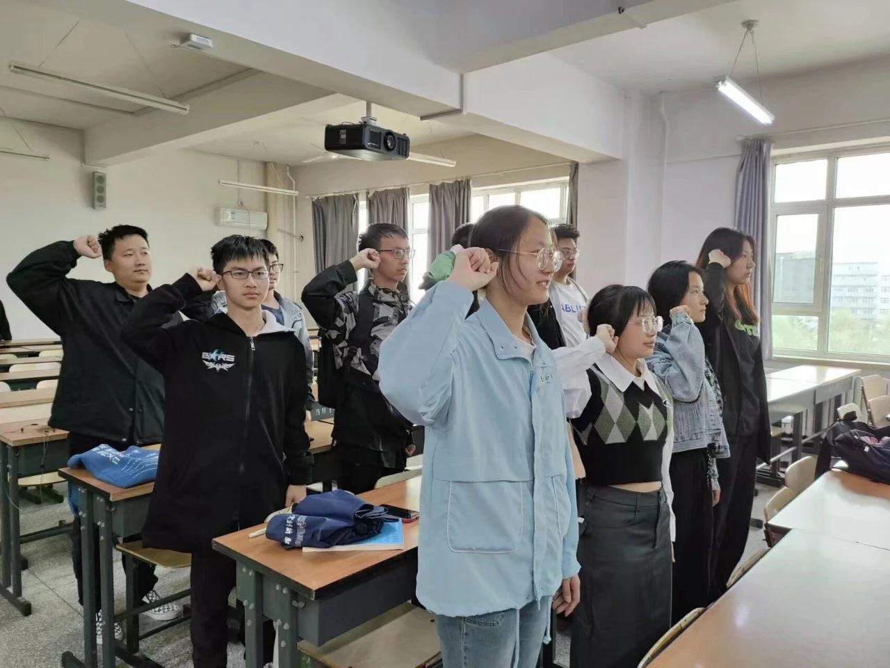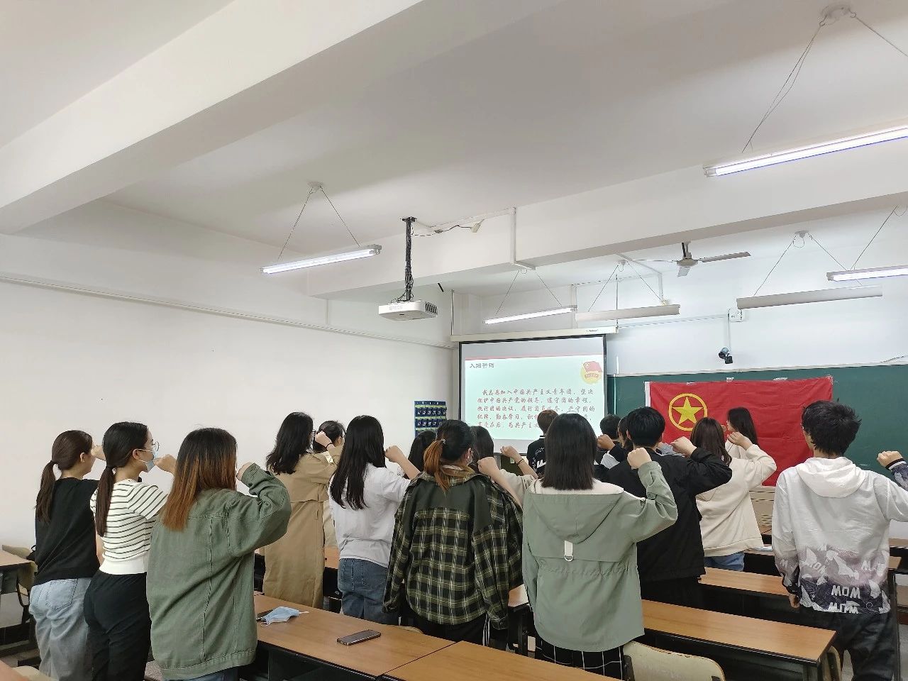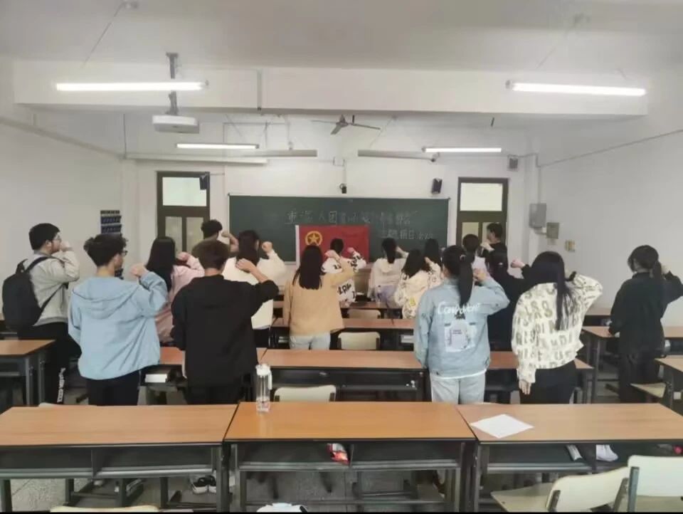 “我志愿加入中国共产主义青年团,坚决拥护中国共产党的领导,遵守团的章程,执行团的决议,履行团员义务,严守团的纪律,勤奋学习,积极工作,吃苦在前,享受在后,为共产主义事业而奋斗。”在一声声洪亮的宣誓中,22级三班同学们开始了本次的主题团会。