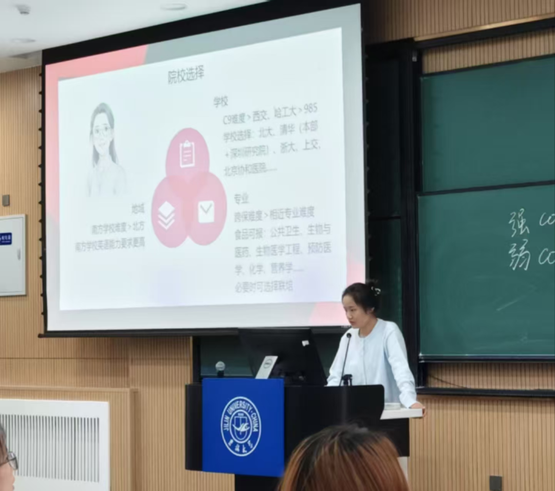 第三位分享的是郭敏学姐,现已保研至哈尔滨工业大学生物与医药专业。她强调了保研前期准备的重要性,从专业成绩的提升、科研项目的参与,到各类竞赛的积累,她结合自身经历,为同学们梳理了保研的必备条件。她还分享了自己在选择保研院校和专业时的心路历程,提醒同学们要根据自己的兴趣和职业规划做出合理选择,不能盲目跟风,找到属于自己的路。